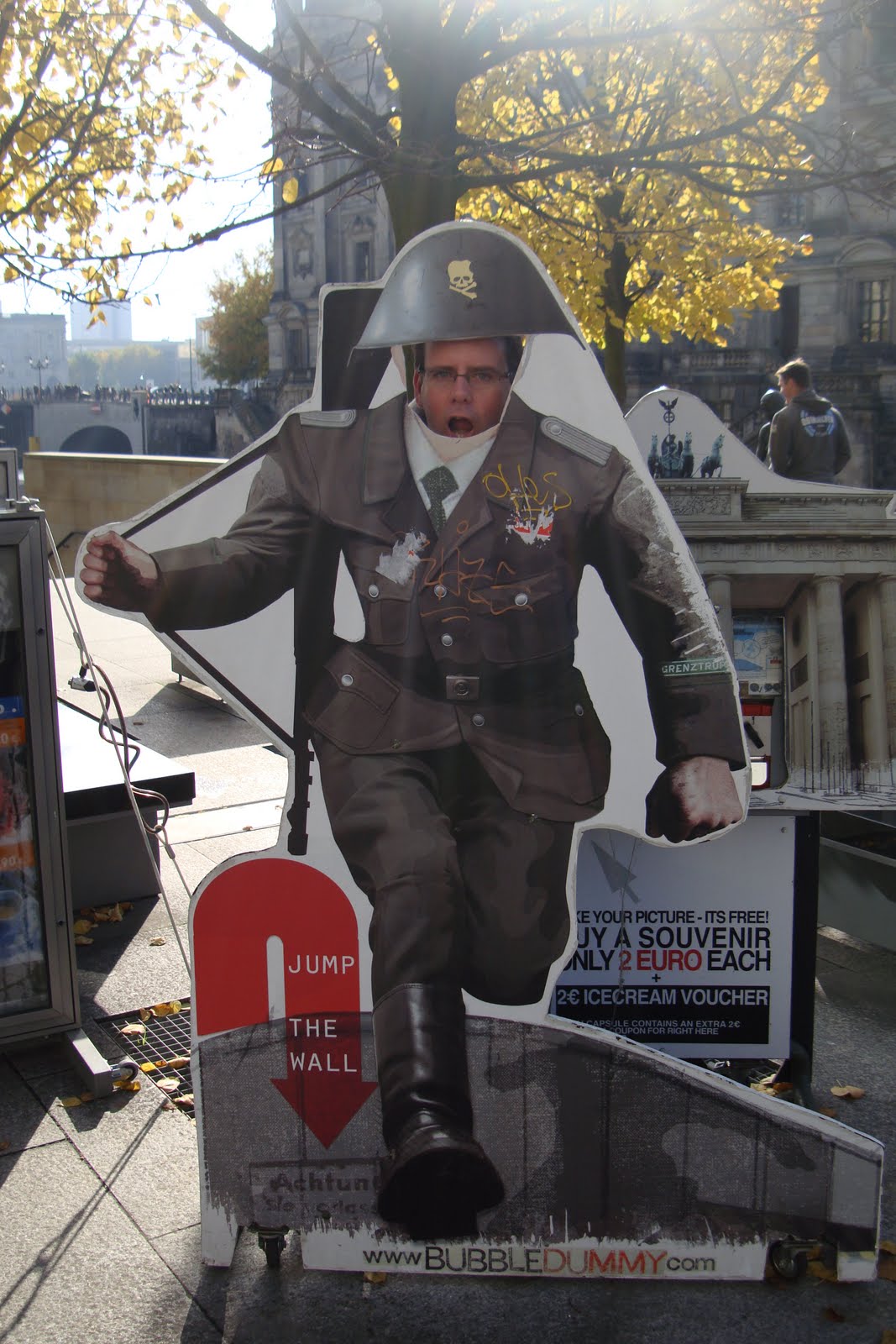 Unfortunately Berlin is not awash with moving pavements so for the remainder of the day our son has to learn to walk again. We have a fruitless trek to find a street which is supposedly full of post-war Russian architecture (we couldn’t find it so had an argument) but our mood lifts when we see a put-your-face-through-the-hole cardboard cut-out of a German soldier. Hubby, as you can see, can’t resist this; it’s just so “kiss me quick”.