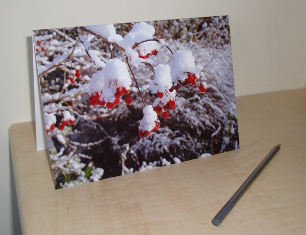 How about that! Large A5, stiff card, decent envelopes and all my own work. Of course the problem is, I would like the recipients of the card to know this was ALL MY OWN WORK and by not having anything pre-typed on it, they will think I’ve just picked it up from WH Smiths. So I will have to scribble “Notice the lovely picture? I did that!” on every one.