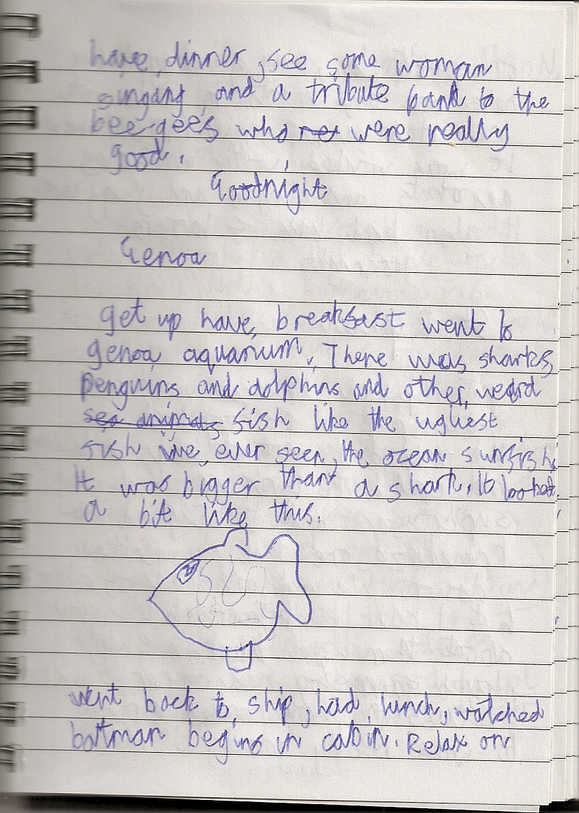After sharing my rather earnest and slightly prissy travel diaries with you this week, I showed them to my son Rory. He roared with laughter and then reminded me that he completed a travel diary during our Mediterranean cruise in 2006. He has happily given permission for me to share some extracts with you.