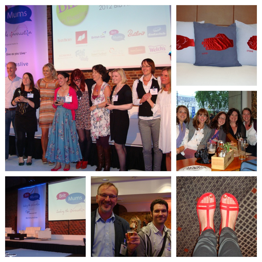 Clockwise from top left: some of the winners of the Brilliance in Blogging awards with presenter Katy Hill; cushions at The Hoxton Hotel; the girls in All Bar One; part of my prize, new Crocs sandals; the Daddy Bloggers Tim and Tom; the main stage for BritMums Live.